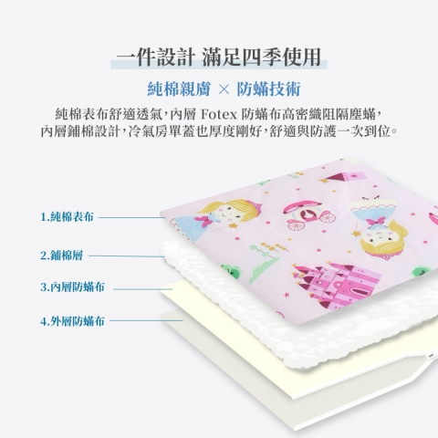 雙面 Fotex Cotton 防蟎材質層,100% 完全阻隔塵蟎,使用好安心。