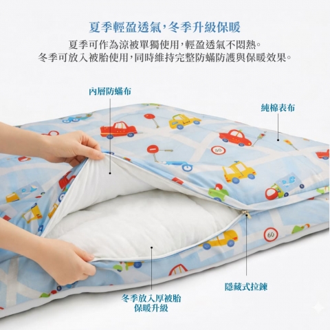夏天可直接當涼被使用,冬天可套入被胎增加保暖度,一年四季皆實用。