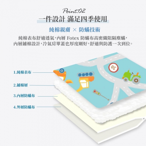 雙面 Fotex Cotton 防蟎材質層,100% 完全阻隔塵蟎,使用好安心。